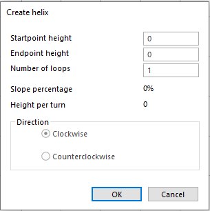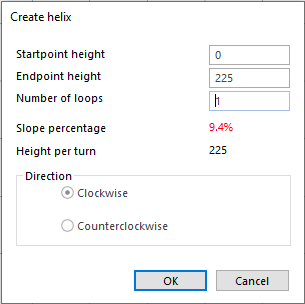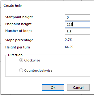 So now we have a 2.7% slope helix if this is too steep for you then you have three options open to you, either increase the radius if space allows or reduce the clearance height you are happy to accept or make an oval shaped helix to add run to each turn. Its most likely that you will have to increase the radius or go for an oval helix.