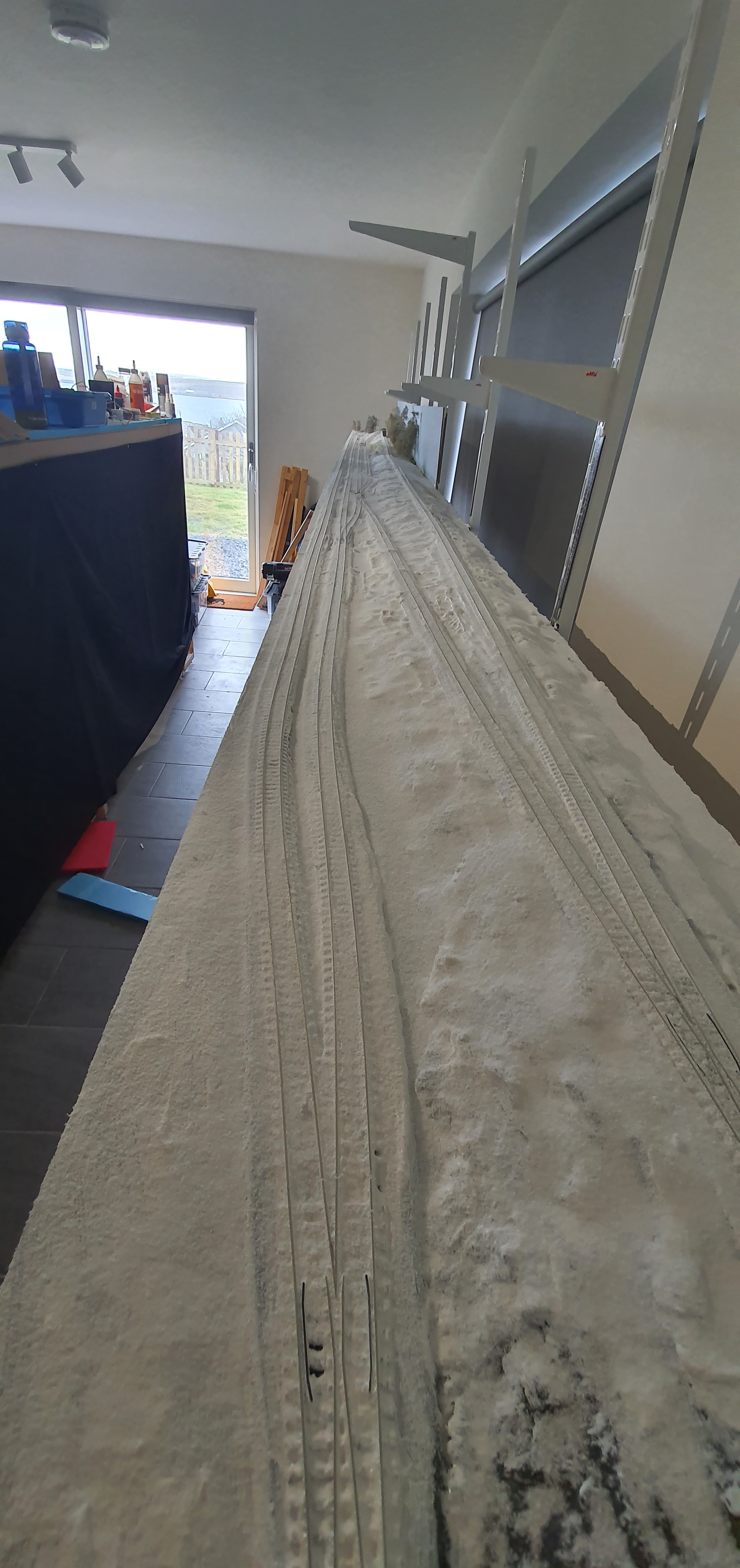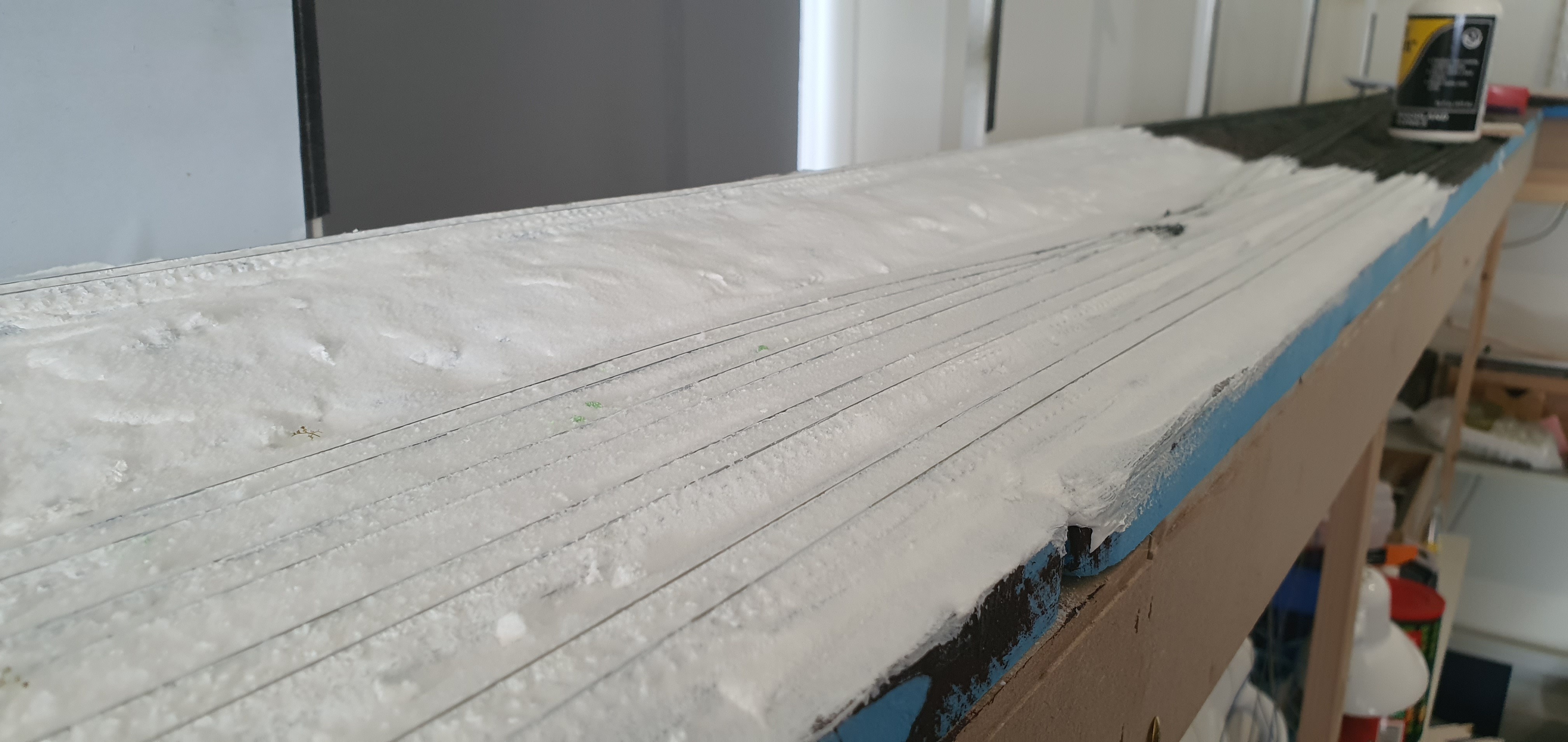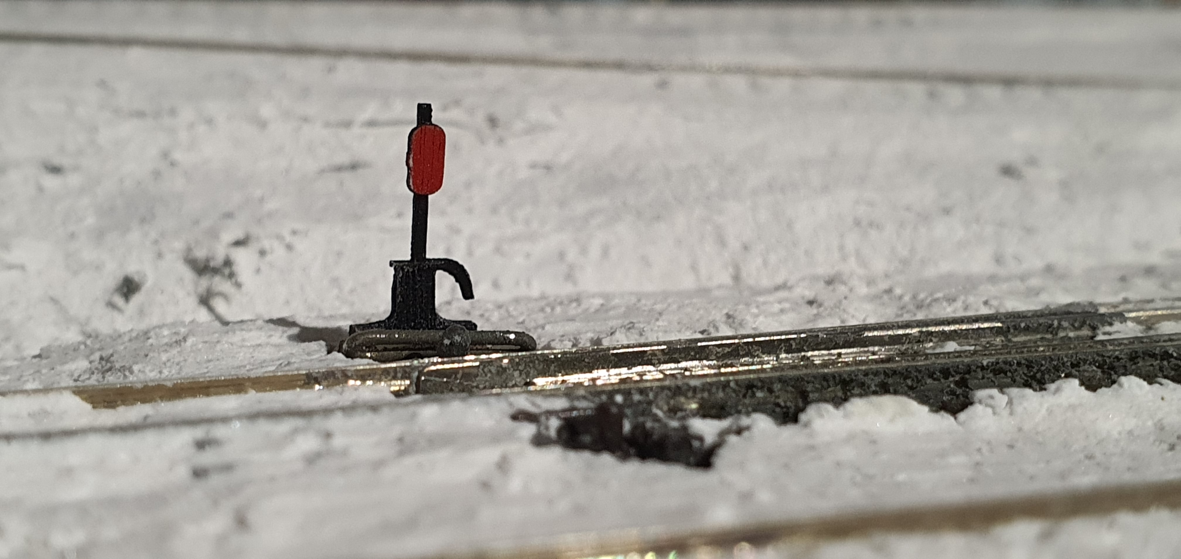 Having previously cleared the snow from the inside of the rails, I decided to remove the snow from the outside of the rails too. It was the usual method to remove the snow a sharp dental implement dragged along the side of the rail.