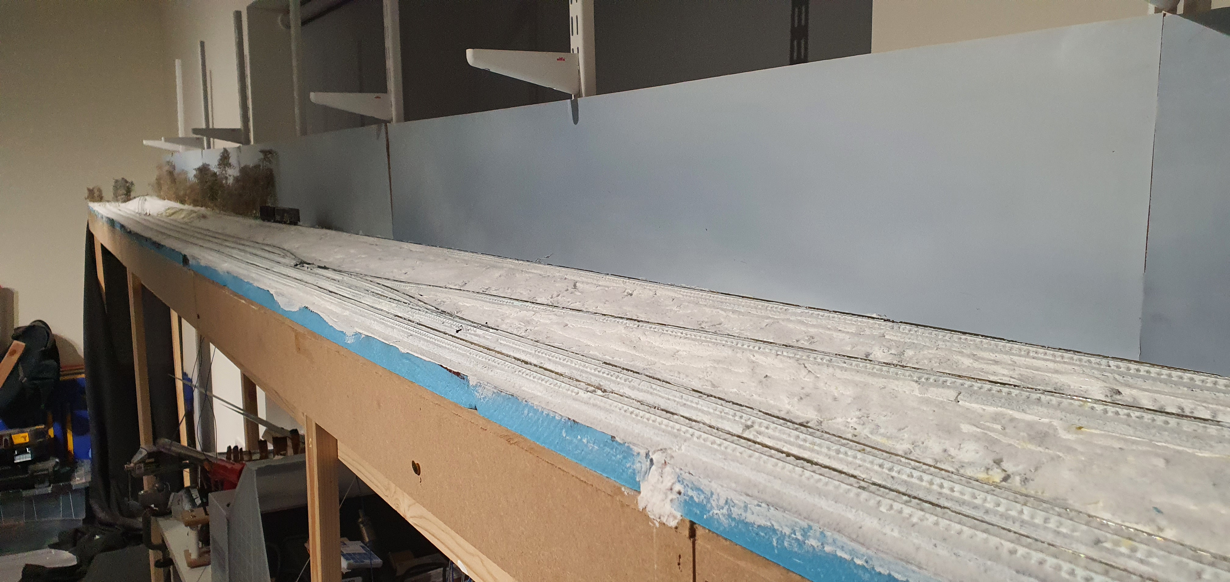 Because of the embankment with the WSOR tracks you can’t even see the foliage but it hides the gap between the backscene and baseboard.