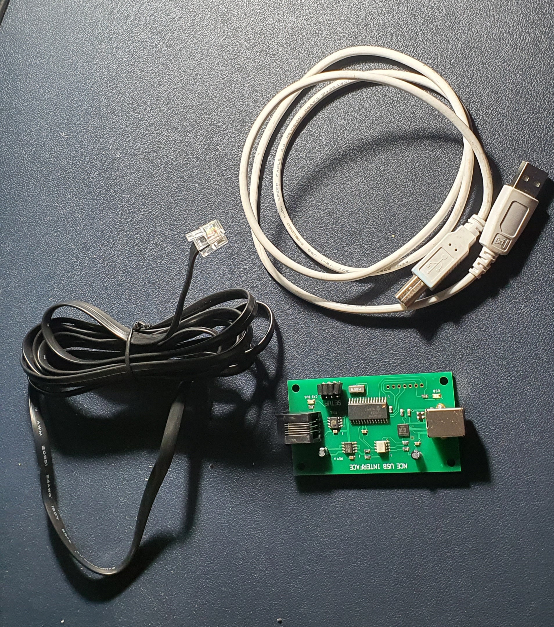 So this is what you need to interface an NCE powerCab to your PC. Its a standard NCE Cab bus cable, a NCE USB Interface and a USB A>B cable like you use for hooking up a printer.